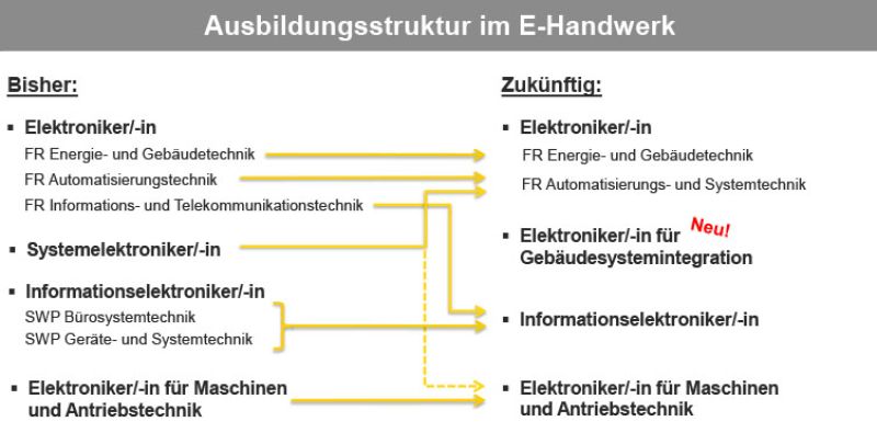 Mit der Neuordnung der Ausbildungsberufe reagiert der Verband auf die Entwicklungen in der Technik und am Markt. Der Elektroniker differenziert sich künftig nur noch in zwei Fachrichtungen: Energie- und Gebäudetechnik sowie Automatisierungs- und Systemtechnik. Dabei bleibt der Elektroniker/in Fachrichtung Energie- und Gebäudetechnik erhalten, ebenso der Elektroniker/in für Maschinen und Antriebstechnik. Bewährte Strukturen werden beibehalten, Themen aus den Bereichen Digitalisierung und Energiewende fließen jedoch in die Lerninhalte ein.